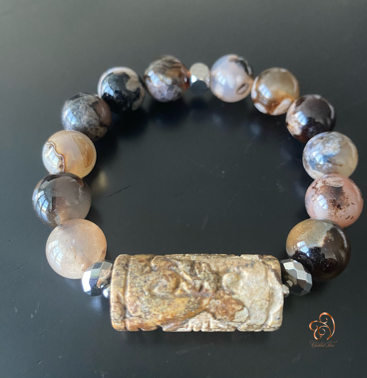 Dare to be different with this stackable agate bracelet and carved centerpiece of natural hues. Wear it alone or pair with others for a bold statement.